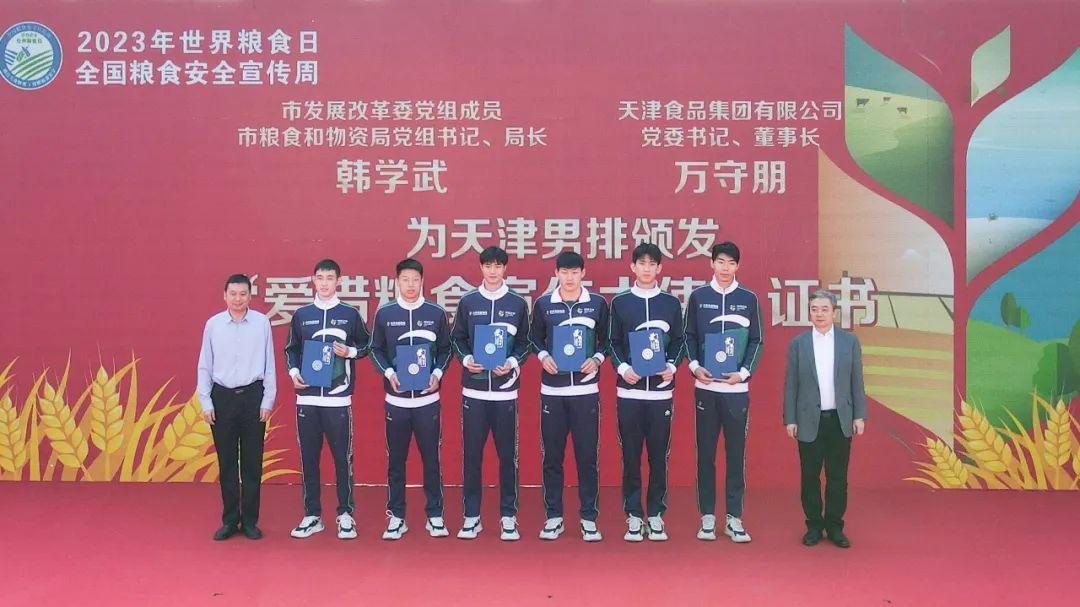 韓學武、萬守朋為天津食品集團男排頒發(fā)“愛惜糧食宣傳大使”證書。旨在進一步宣傳節(jié)約光榮、浪費可恥的思想觀念,倡導全民健身活動,倡導健康文明的新生活方式。