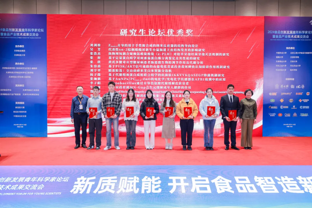 開幕式上,北京工商大學王彥波教授、大連民族大學曹際娟教授為8位研究生代表頒發(fā)2024食品創(chuàng)新發(fā)展青年科學家論壇“研究生論壇優(yōu)秀獎”。