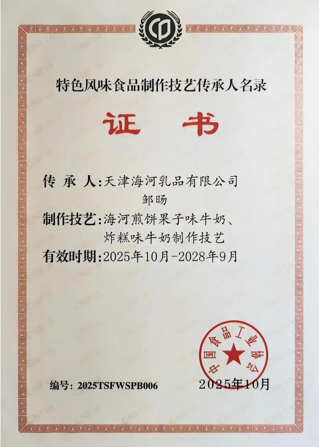 近日,中國食品工業(yè)協(xié)會(huì)公布第二批“特色風(fēng)味食品標(biāo)志性產(chǎn)品、制作技藝傳承人名錄”。海河乳品公司黨委書記、董事長鄒旸榮獲“特色風(fēng)味食品制作技藝傳承人”稱號(hào)。煎餅果子味牛奶、炸糕味牛奶榮膺“特色風(fēng)味食品標(biāo)志性產(chǎn)品”。這一由國家行業(yè)權(quán)威組織、經(jīng)專家多輪評(píng)審認(rèn)定的成果,標(biāo)志著海河乳品公司在傳承與創(chuàng)新地域特色食品、推動(dòng)傳統(tǒng)風(fēng)味現(xiàn)代化轉(zhuǎn)型方面走在了行業(yè)前列,為老字號(hào)品牌注入了強(qiáng)勁動(dòng)能。